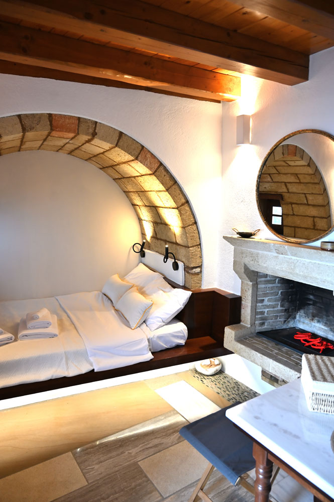 Its bed lies within a stone arch, right next to the fireplace.